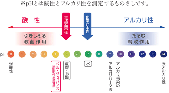 一般的な弱酸性とは水(中性ph7.0)を基準としph6.0前後としていますが、ベル・ジュバンス弱酸性美容法は